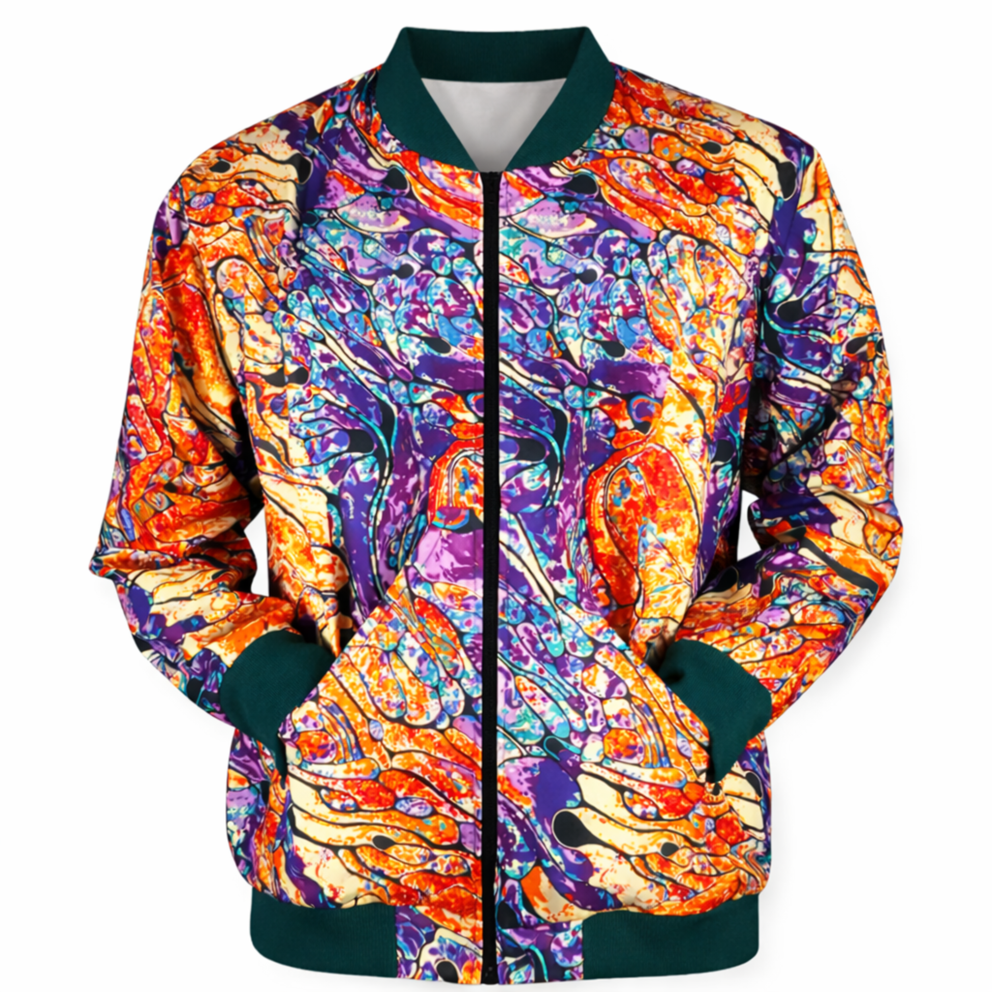 Turn heads with this bold unisex bomber jacket featuring a vibrant abstract marbled print in rich shades of purple, orange, yellow, and teal. Designed for standout streetwear styling, this piece blends color, movement, and confidence into one powerful look.